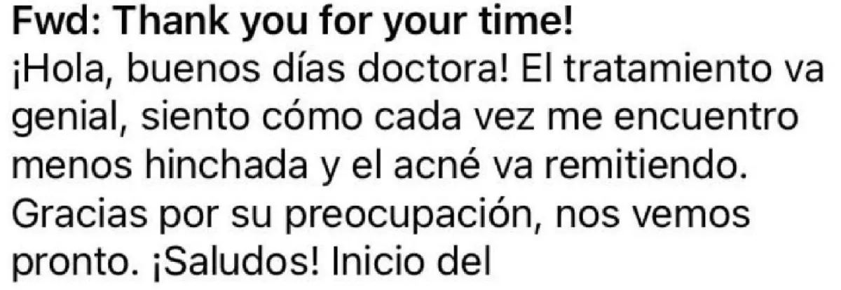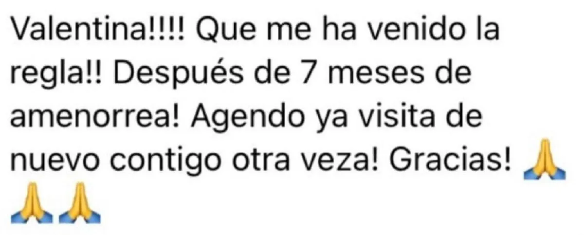 "Hola amiii. Me vinooo. Después de año y medio. No sé cuanto me vino. Poquito creo. Fue hoy en la mañana."